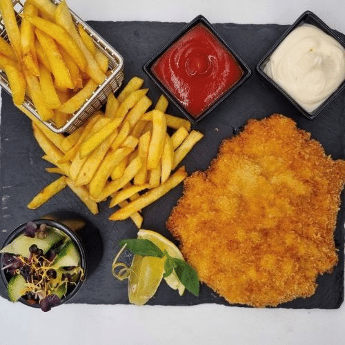 Schweineschnitzel mit Pommes frites und Gurkensalat